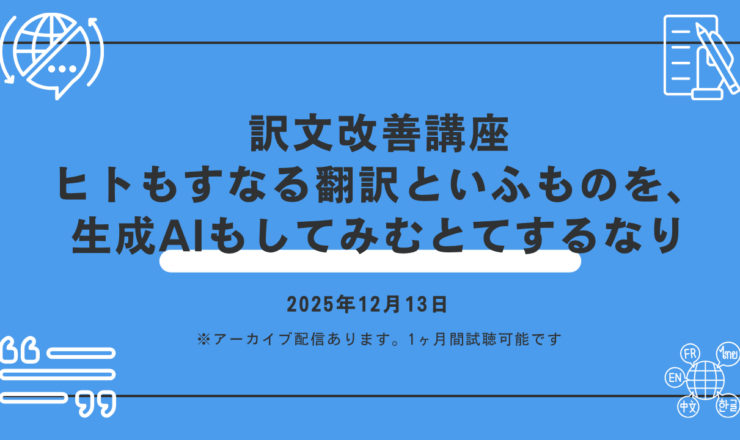 2025年12月13日(土曜日) 日本時間19時00分開始 チケットはこちら イベント概要 今回で第4弾となる「訳文改善講座」...